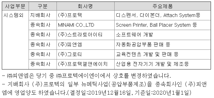 1) 동사는 2000년 9월에 Dispenser용 Head Kit 부문 등 특허 취득과 S.M.T용 Dispenser(PRO2000) M/C를 개발 완료했으며, 개발 및 생산은 당사가 맡고 삼성테크윈이 판매하는 O.E.M 공급계약을 체결함.