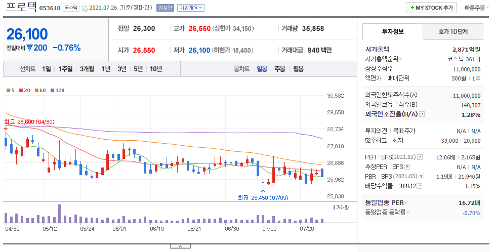 프로텍 주가가 강세다. 반도체 품귀현상이 여전할 것으로 예상되는 가운데 반도체 후공정(패키징) 생산성을 100배 이상 높이는 기술을 개발한 소식이 부각된 것으로 보인다. 19일 오전 10시42분 기