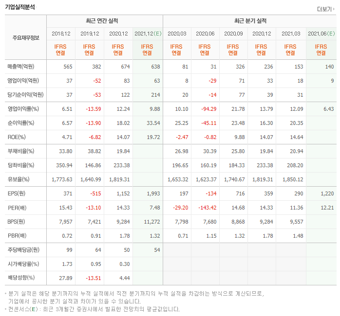 1) 동사는 1분기 매출액은 152억 8000만 원, 영업이익은 18억 5000만 원, 당기순이익은 31억 1000만 원을 달성한 이후, 2분기 매출액은 138억 원, 영업이익 4억 원을 달성함.