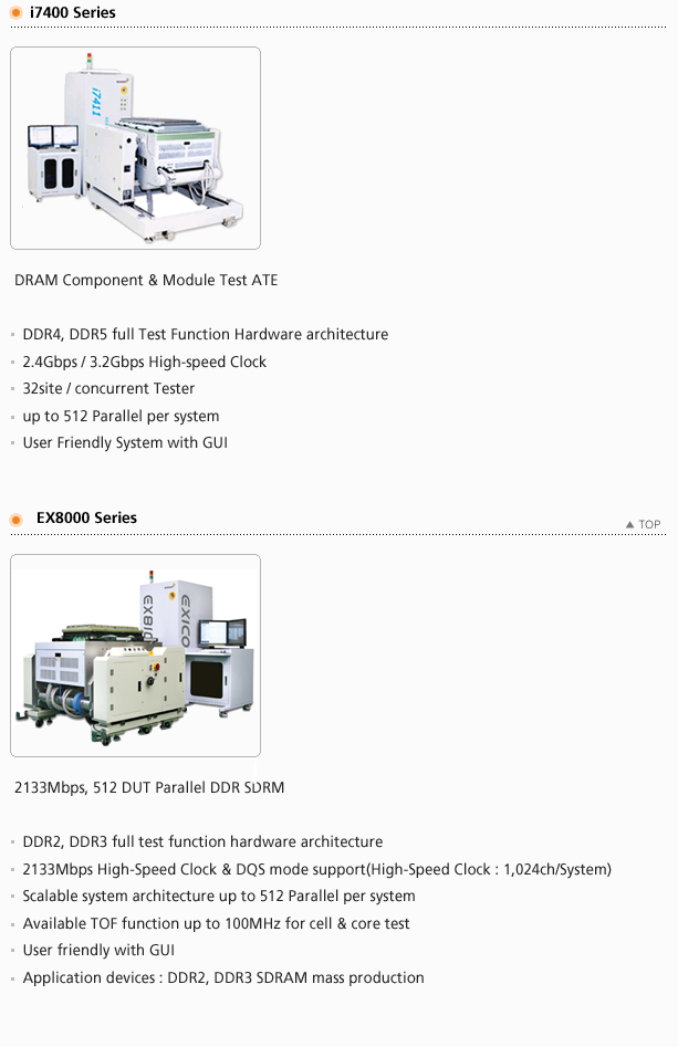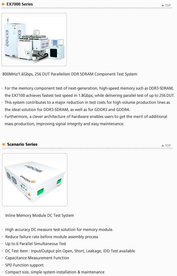 -. 엑시콘은 장비 포트폴리오의 다변화를 적극적으로 추진하고 있으며, DRAM 테스트 장비에서는 DDR2, DDR3, DDR4 테스트 수요에 대응해왔음.
